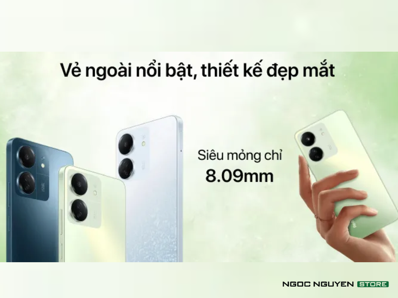 Redmi 13C có mặt lưng phẳng và màn hình phẳng, mang đến cảm giác hiện đại và tinh tế, cùng với đó là mặt lưng được làm từ nhựa giúp giảm khối lượng tổng thể của thiết bị cũng như tối ưu được chi phí sản xuất nhằm mang lại mức giá cực kỳ phải chăng.