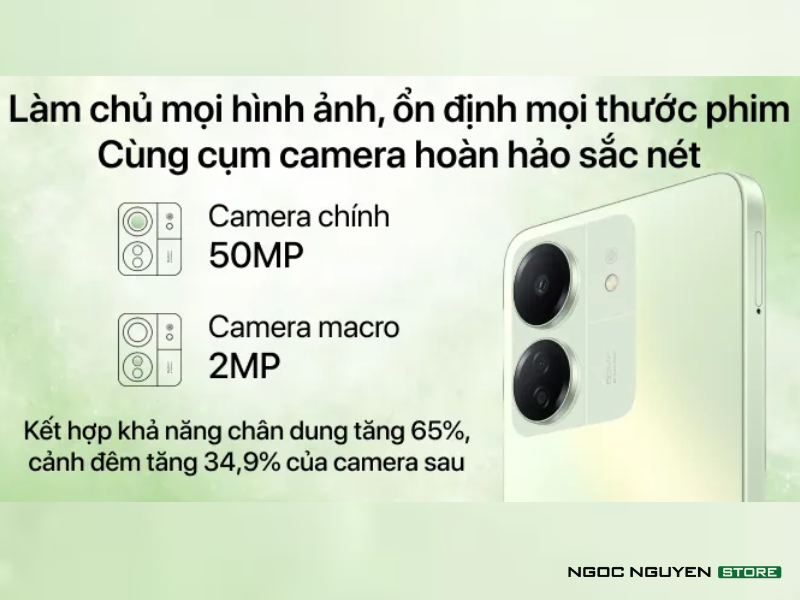 Xiaomi Redmi 13C trang bị camera sau với camera chính có độ phân giải khủng 50 MP, đảm bảo chất lượng hình ảnh cực kỳ rõ nét và chi tiết. Ống kính này giúp bạn thu lại trọn vẹn mọi khung cảnh với màu sắc sống động và độ sáng tốt, cho phép bạn tạo ra những bức ảnh chất lượng cao.