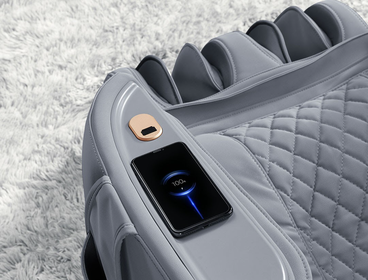 Bệ tay đối diện được tích hợp mặt đế sạc không dây cho smartphone vô cùng tiện lợi để người dùng có thể thoải mái sử dụng trong quá trình massage.