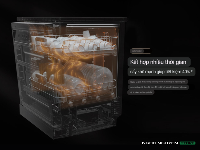 Sau khi giặt xong, kết hợp sấy khô mạnh hơn được sử dụng để tiết kiệm 40% thời gian sấy. Sau đó, không khí nóng (từ 80 ° C) được sử dụng, phối hợp với việc đóng và mở cửa tự động để thúc đẩy trao đổi nhiệt và sự kết hợp này giúp cải thiện hiệu quả sấy.