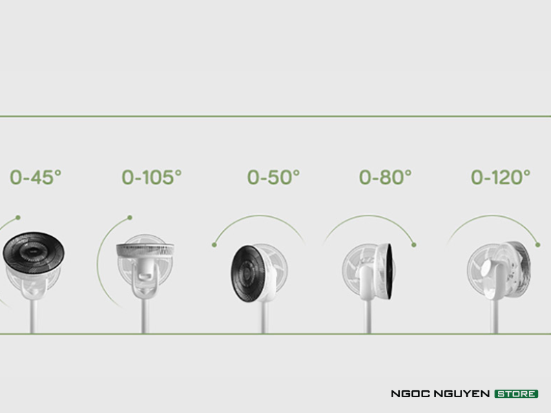Quạt tích điện Keheal F4 có góc làm mát rộng và dễ dàng điều chỉnh, bạn có thể chọn góc quay 50°, 80°, 120° theo chiều ngang và góc quay 45°, 105° theo chiều lên/xuống. Chế độ quay từ trái sang phải và từ trên xuống dưới của quạt có thể hoạt động độc lập hoặc đồng thời.