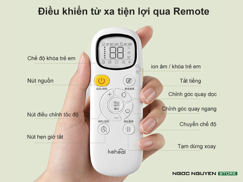 Quạt tích điện Keheal F4 mang đến cho bạn hai phương thức điều khiển tiện lợi: bảng điều khiển và điều khiển từ xa. Bảng điều khiển được đặt trên phần đỉnh của quạt, các nút bấm được thiết kế đơn giản, dễ dàng sử dụng. Điều khiển từ xa đi kèm theo quạt còn tích hợp màn hình hiển thị đầy đủ các thông số, cho phép bạn điều chỉnh quạt từ bất cứ vị trí nào trong căn nhà.