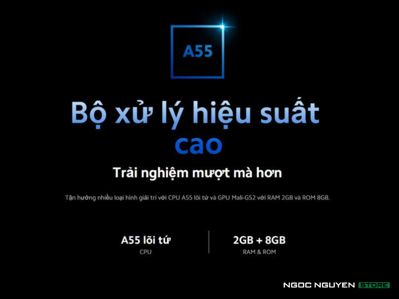 Bộ xử lý hiệu suất cao trải nghiệm mượt mà hơn tận hưởng nhiều loại hình giải trí với CPU A55 lõi tứ và GPU Mali-G52 với RAM 2GB và ROM 8GB.