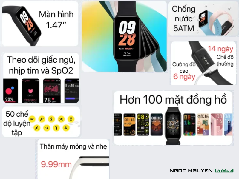Sở hữu hơn 150 chế độ luyện tập, Xiaomi Band 8 Active cung cấp đầy đủ các bài tập cho người dùng. Đối với người dùng thường xuyên chạy bộ, Band 8 Active cung cấp chi tiết các thông tin về sức khoẻ như nhịp chân, khối lượng tập, thời gian phục hồi,...Và các bài tập từ cơ bản đến nâng cao, giúp người dùng rèn luyện cơ thể khoa học nhất. Ngoài ra, thiết bị còn có các tính năng theo dõi nhịp tim, theo dõi giấc ngủ, theo dõi độ stress, theo dõi chu kỳ kinh nguyệt,...