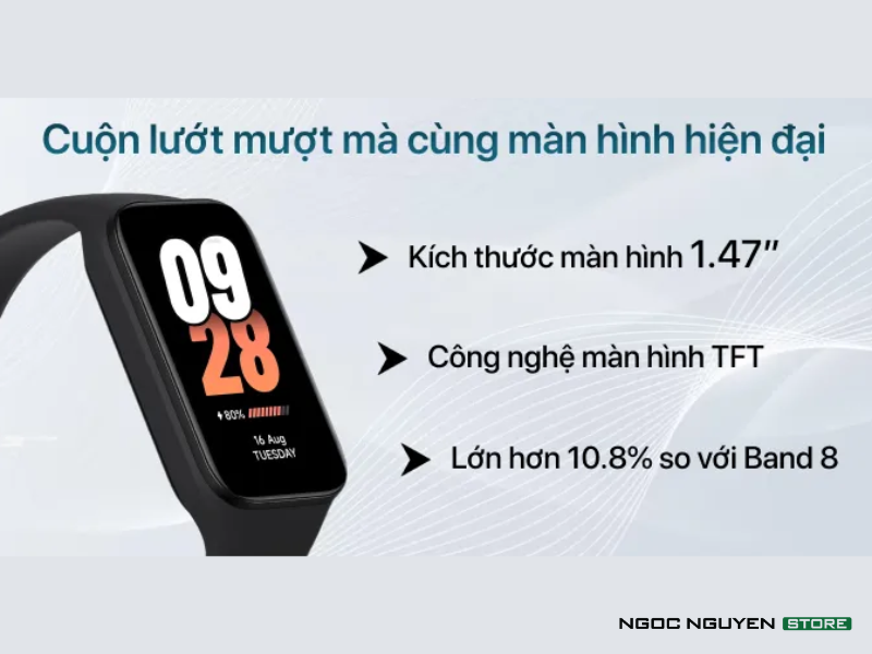 Điểm gây ấn tượng đặc biệt nhất trên con Xiaomi Band 8 Active này là tính năng tự động thay đổi độ sáng theo điều kiện môi trường xung quanh. Bên cạnh đó, thiết bị còn được trang bị màn hình LCD có kích thước 1,47 inch và độ phân giải 172x320 px. Phần viền màn hình khá mỏng, mang diện tích lớn để hiển thị những nội dung trên đồng hồ. Khả năng cảm ứng của màn hình cũng được Band 8 Active đáp ứng nhanh nhạy khi chỉ cần chạm là đã sáng lên ngay lập tức.