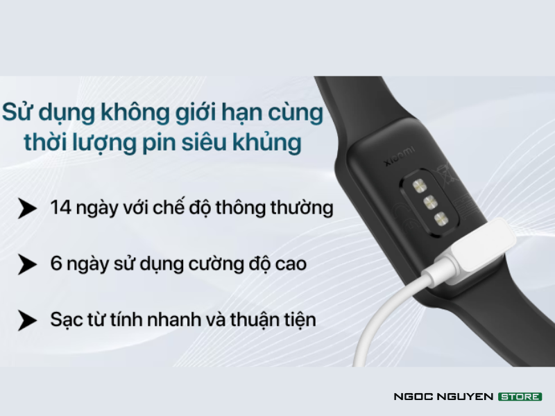 Xiaomi Band 8 Active đem đến thời lượng pin khá lớn và người dùng hoàn toàn không cần phải lăn tăn về pin của thiết bị này. Band 8 Active có thể hoạt động trong vòng 7 ngày nếu người dùng sử dụng thường xuyên và lên đến 14 ngày nếu chỉ dùng ở mức cơ bản.